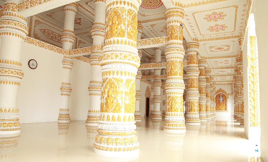 Bước vào sâu hơn, bạn sẽ bắt gặp hàng cây cổ thụ trăm năm tuổi, bóng mát đổ dài dẫn lối đến chánh điện nguy nga – nơi thờ Đức Phật Thích Ca. Toàn bộ công trình được nâng đỡ bởi sáu hàng cột lớn, mái chồng ba tầng, trang trí rồng, tiên nữ Keynor và chim thần Krud – vừa uy nghi, vừa mềm mại đặc trưng phong cách Khmer.